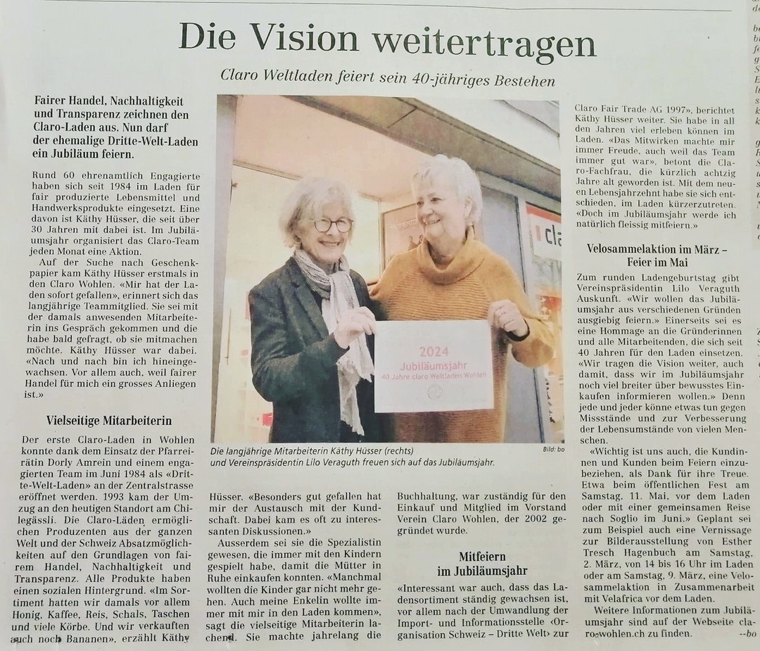 Das claroteam Wohlen lanciert eine Passivmitgliedschaft, um das claro-Gedankengut und den Laden besser abzustützen. - Lesen Sie hier die ausführliche Chronik unserer 30-jährigen Ladengeschichte mit Bildern und Statements von ehemaligen Ladenfrauen